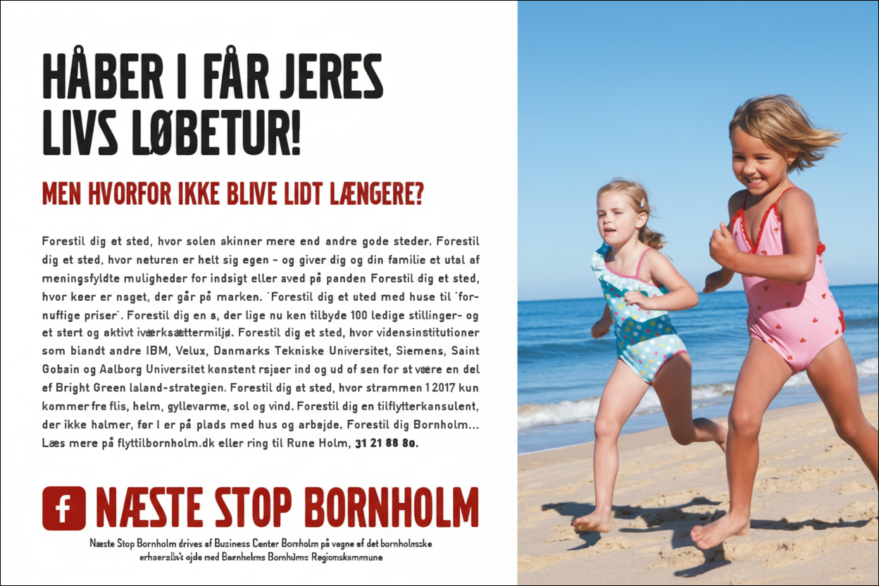 Annonce til Bornholms tilflytterindsats (Næste stop Bornholm) i regi af Business Center Bornholm. Missionen var at inspirere øens gæster til at blive lidt længere…:-)